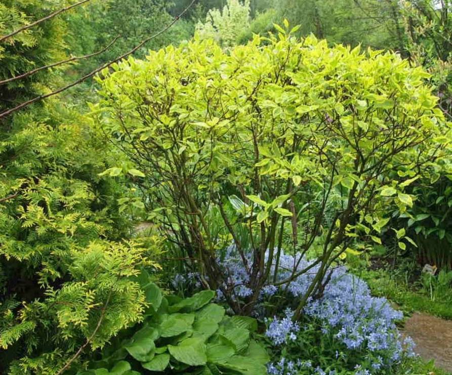 • цветет белыми щитковидными соцветиями. Саженцы белого дерена Гоучаулти лучше высаживать на солнечных участках, так как в тени цвет листвы тускнеет.