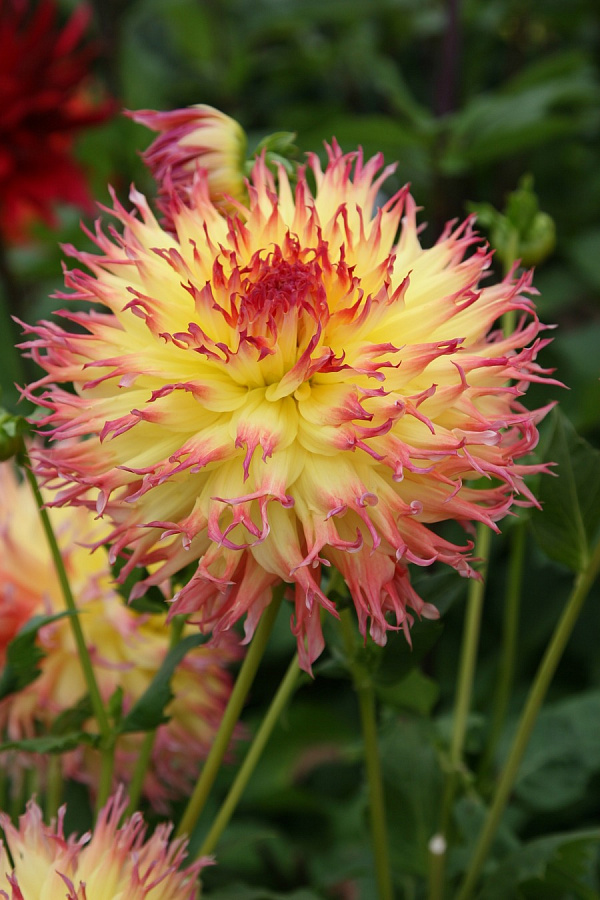 Георгина бахромчатая Pinelands Pam - это великолепное растение с ярко-желтыми цветками и красно-малиновыми кончиками, которое порадует вас своим великолепием в течение нескольких месяцев в году. Ее высота может достигать 90 см, а размер цветка равен 20 см, что делает ее настоящим украшением любого сада.