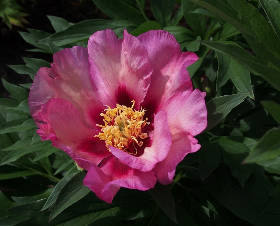 Саженцы пиона ИТО Yankee Doodle Dandy (Янки Дудл Денди) Создает нежные полумахровые насыщенного розовыми лепестками с темно-сливовым глазком, который по мере созревания цветка приобретает кремовые оттенки. Окруженным золотистым центром. Приятный аромат. Листва обеспечивает превосходный осенний цвет, у него тонко нарезанная разделенная зеленая листва, которая весной и осенью становится красной. Бутоны распускаются постепенно: сначала верхушечные, а затем боковые. Благодаря этому взрослые кусты отличаются продолжительным цветением. Саженцы пиона ИТО образуют привлекательные плотные, аккуратные округлые кусты с крепкими стеблями и узкими, темно-зелёной листвой, которая остается зеленой до осени. ИТО-пионы - это уникальные сорта, полученные путем скрещивания травянистых и древовидных пионов. Им присущи лучшие качества обеих групп: многолетники выносливы и устойчивы к жаре и влажности. Характерные особенности растения: