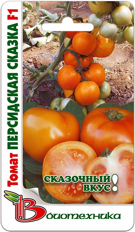 Семена томата "Персидская сказка F1" (Persidskaja skazka F1) проращиваются рассадным способом. Для этого посев производят в конце марта. Пересадку в грунт осуществляют в мае. Через 104-107 дней после появления первых всходов начинается уборка урожая. Плоды округлые, плотные, оранжевого окраса с румянцем персикового оттенка. Средняя масса достигает 130-150 гамм. Помидорки содержат очень большое количество каротина. Вкусовые качества очень высокие. Сорт отличается устойчивостью к самым распространенным вирусным заболеваниям, а также богатым урожаем даже при низких температурах.